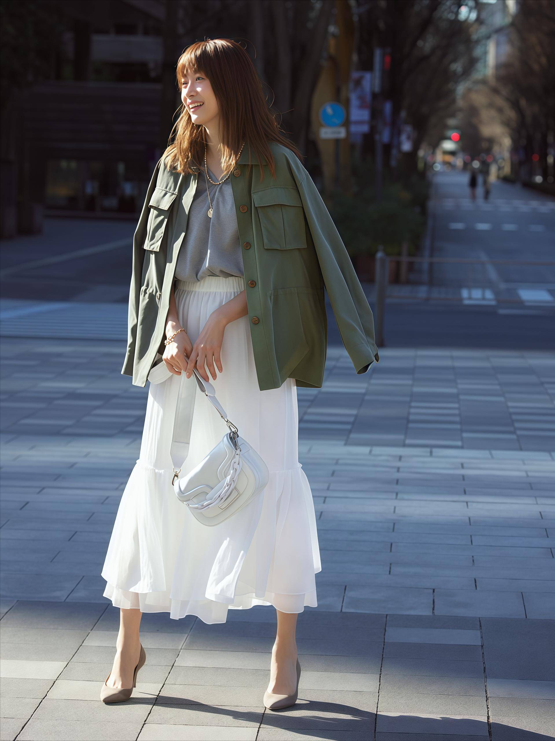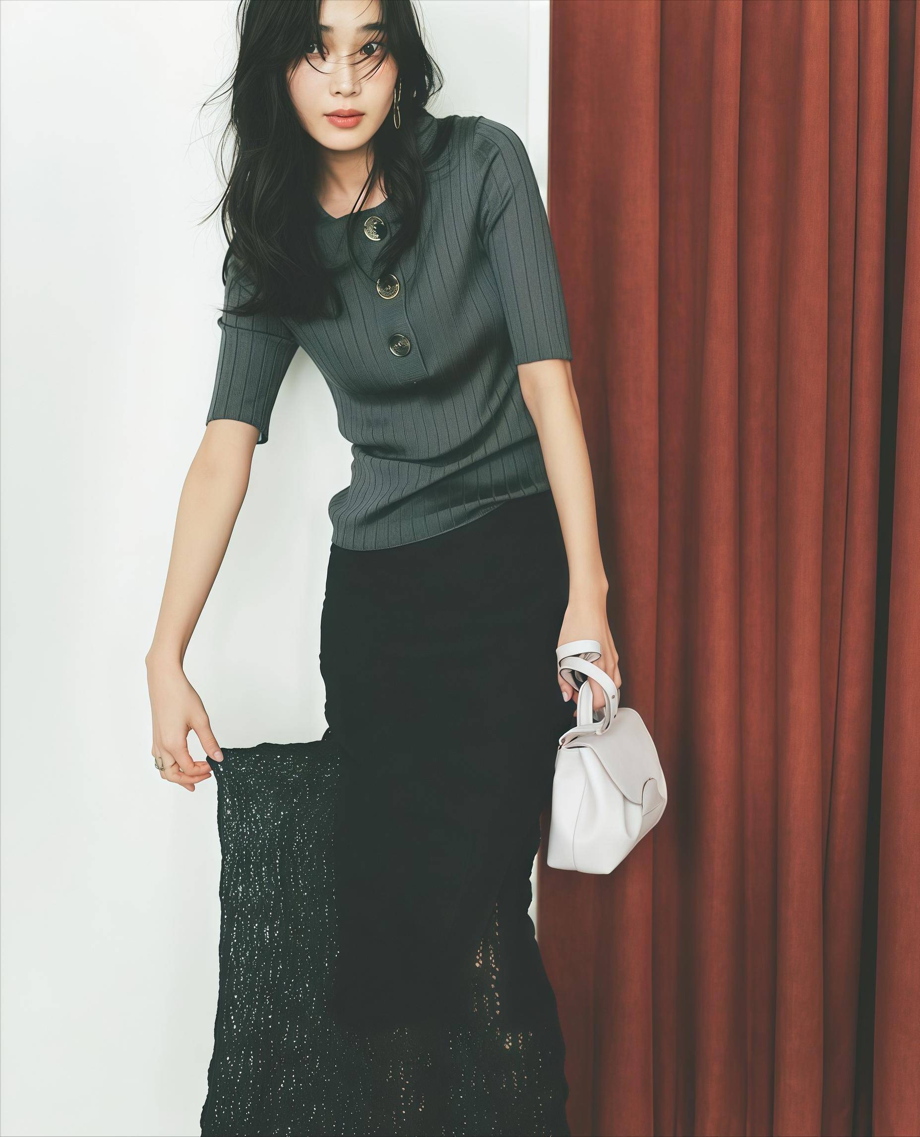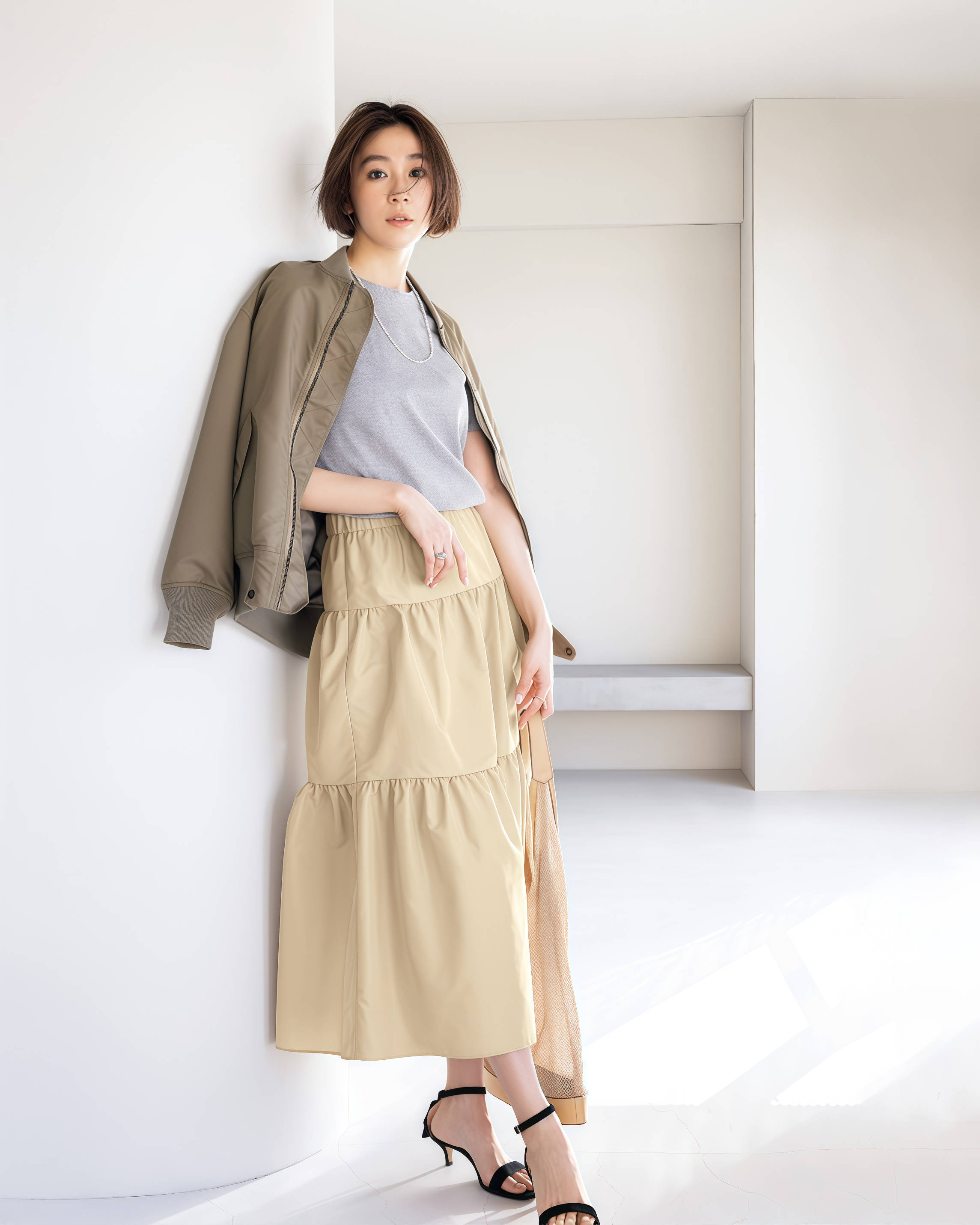 你想往优雅方向靠,鞋子就是最快的调节器,T恤配半裙本身就是偏休闲的风格,建议你换一双尖头细跟鞋,这样整套搭配的气质,直接从“周末逛街”切换到“约会赴宴”,裙子选缎面或蕾丝的效果更明显。