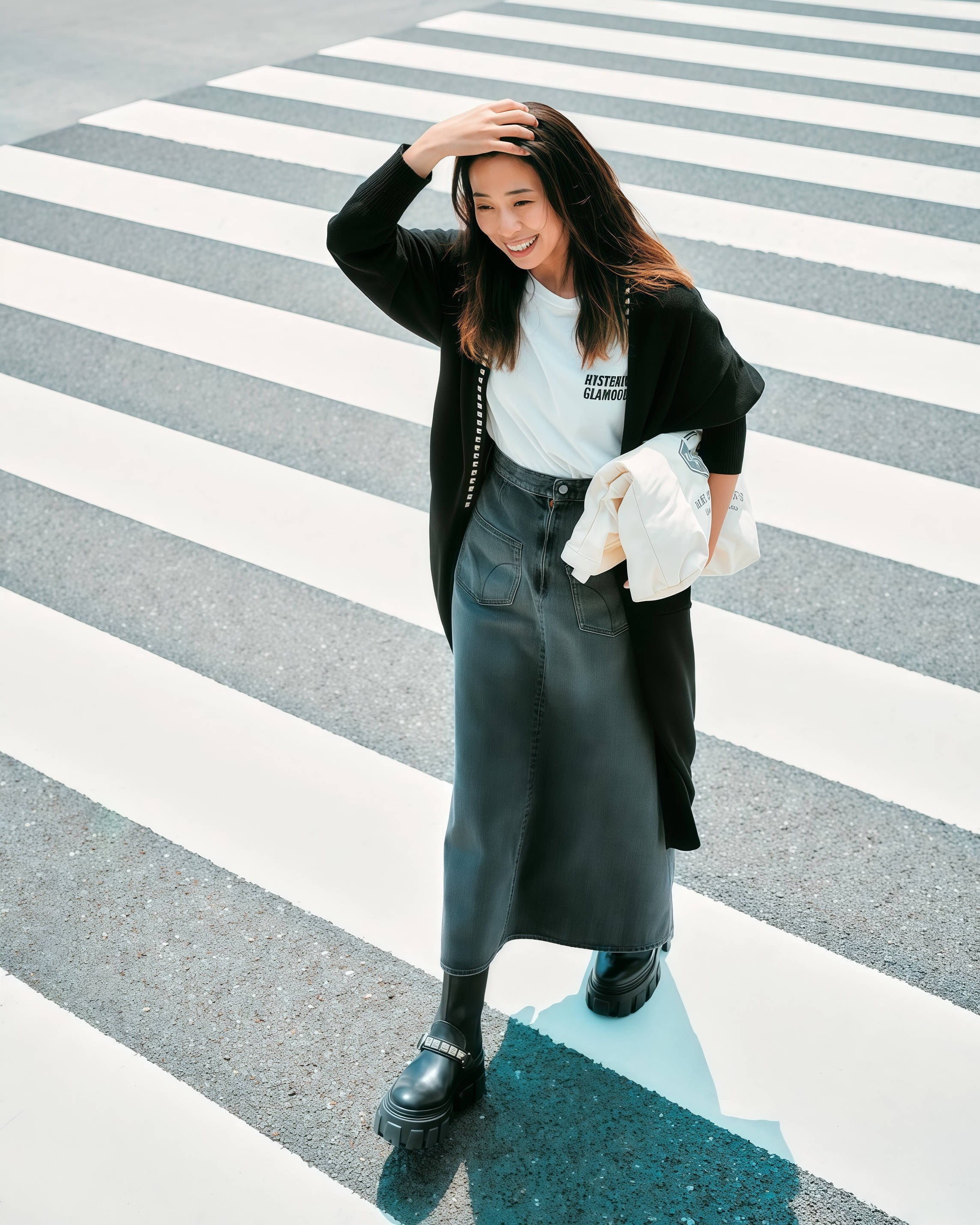 你去看街拍会发现,那些穿T恤配半裙特别出彩的女生,身上的搭配都不复杂,赢就赢在风格的混搭比例控制得好,休闲和女人味各占一半,高级又时髦。