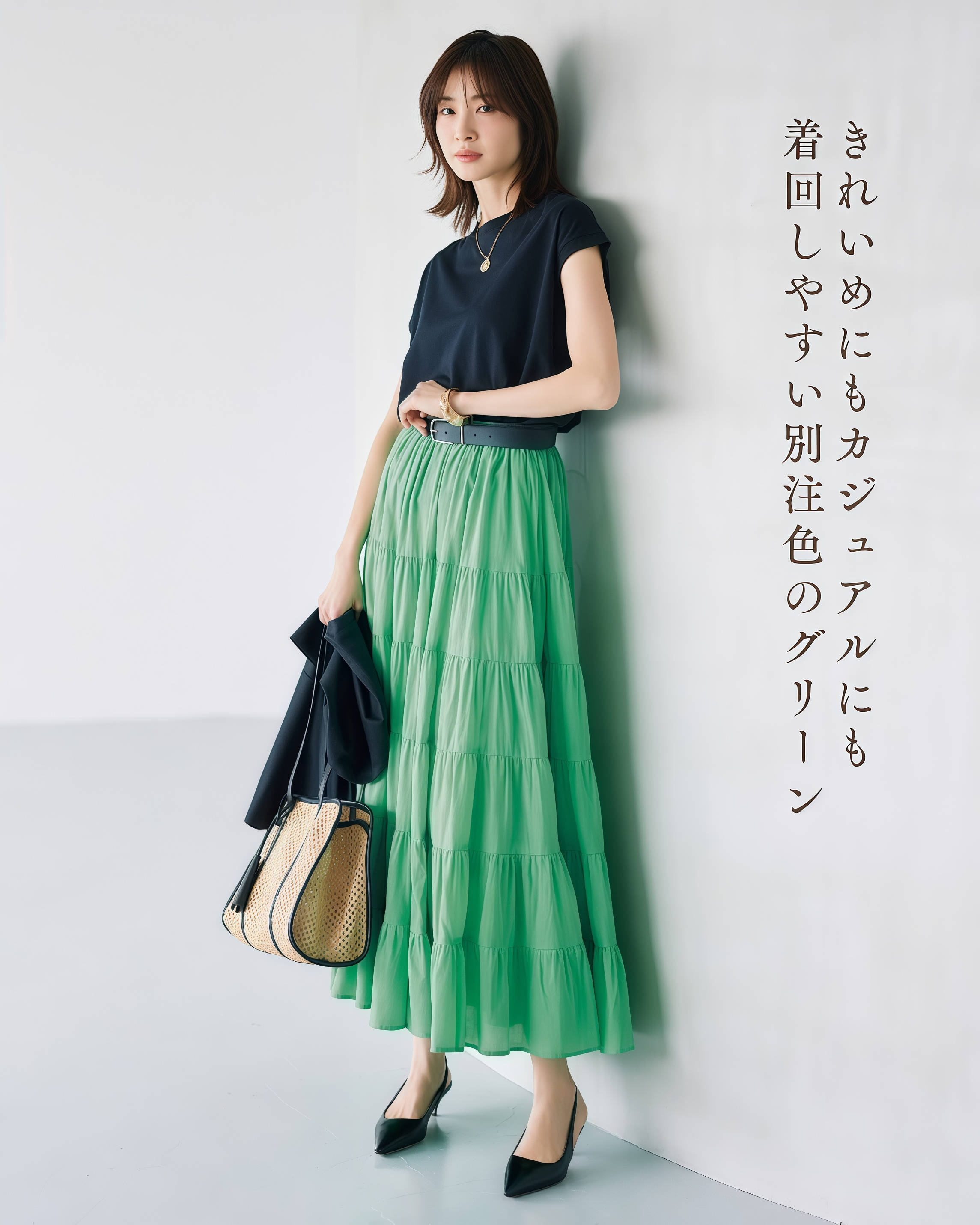 配色不用学太多理论,记住一个原则就够用了,上衣和裙子之间要有明暗差,一深一浅就对了,比如黑色T恤配绿色半身裙,这种“明暗对比”能让你的身材分区更清晰,穿出来既显利落感,又能显高显瘦。